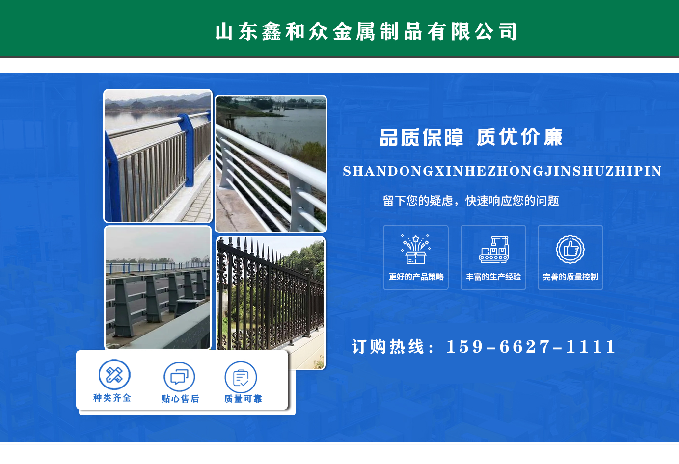 山東鑫和眾金屬制品有限公司主要產(chǎn)品有防撞護(hù)欄,橋梁護(hù)欄,道路護(hù)欄,河道護(hù)欄,不銹鋼護(hù)欄等護(hù)欄。提供設(shè)計(jì)方案,一站式定制,包您滿(mǎn)意價(jià)格優(yōu)惠,歡迎來(lái)電咨詢(xún)! 公司常年從事銷(xiāo)售護(hù)欄防撞護(hù)欄,橋梁護(hù)欄,道路護(hù)欄,河道護(hù)欄,不銹鋼護(hù)欄,橋梁鋼護(hù)欄,河道燈光護(hù)欄等。產(chǎn)品廣泛應(yīng)用于橋梁、河道、旅游景區(qū)、道路、公路、公園、小區(qū)、景觀、道路防撞等領(lǐng)域?! 」井a(chǎn)品均采用優(yōu)質(zhì)不銹鋼材料,符合相關(guān)標(biāo)準(zhǔn)。各種型號(hào)不銹鋼復(fù)合管及護(hù)欄,質(zhì)量嚴(yán)格把控。產(chǎn)品強(qiáng)度高、耐腐蝕、焊接牢固、抗沖擊、性能好,防撞護(hù)欄結(jié)構(gòu)簡(jiǎn)單、美觀實(shí)用大方。 歡迎前來(lái)訂購(gòu)!...